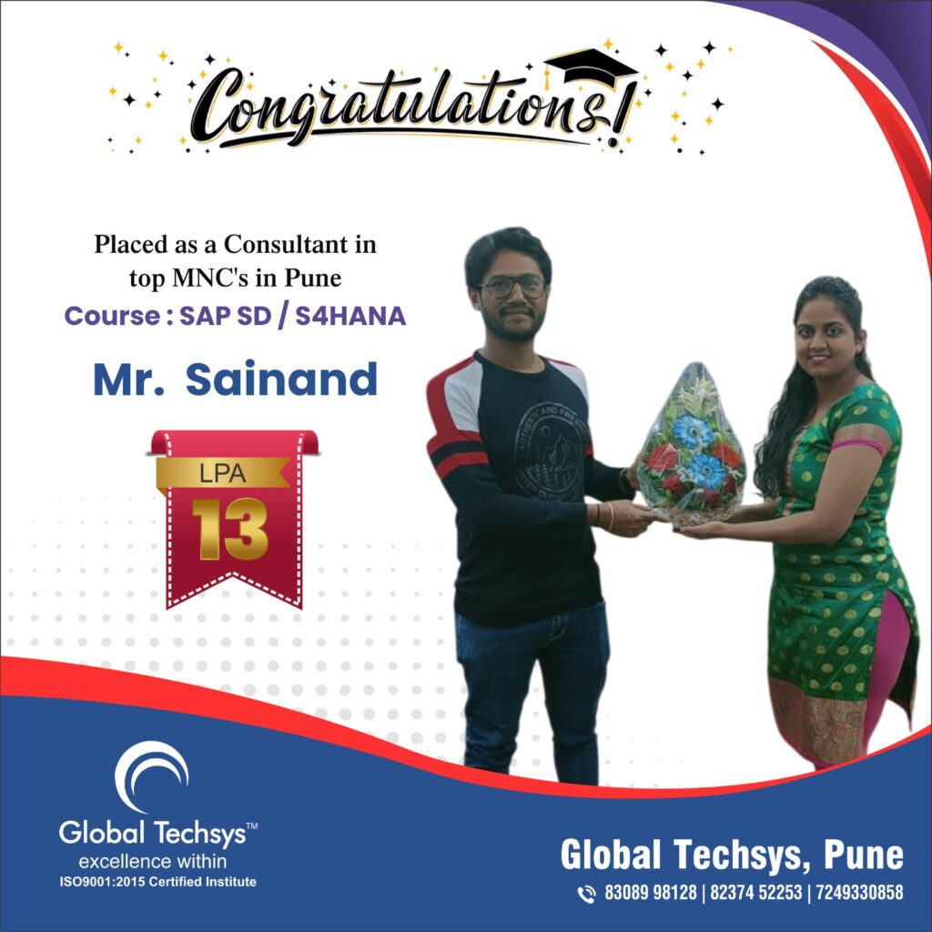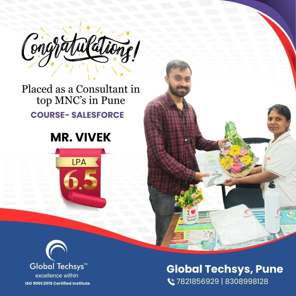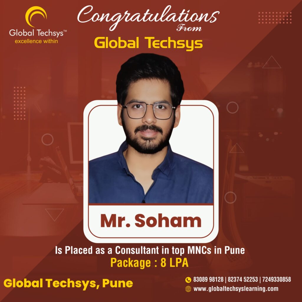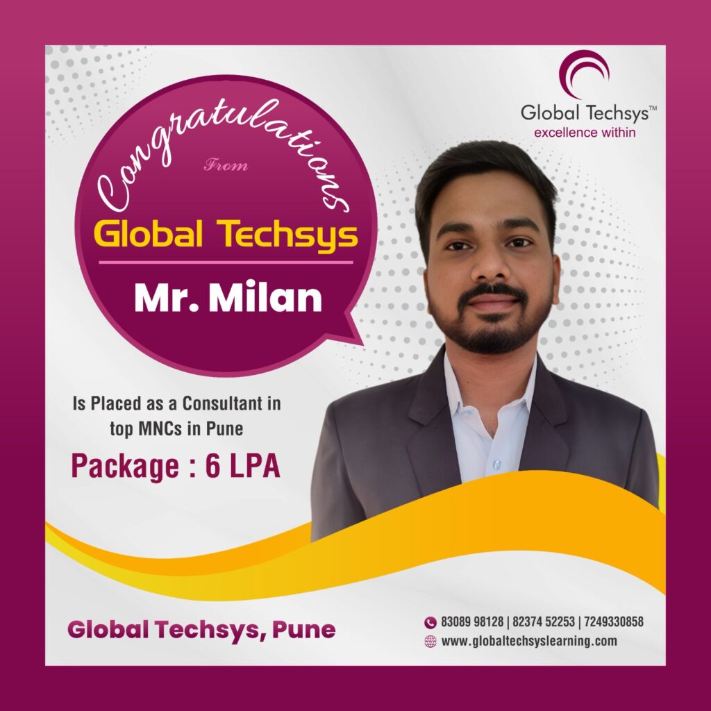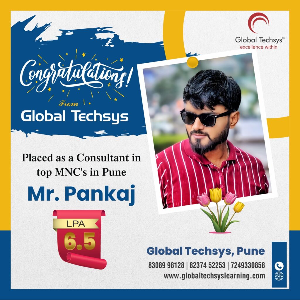 At Global Techsys Learning, our students don’t just learn—they excel. The Placement Gallery is a testament to the dedication and hard work of our graduates who have secured prestigious positions in top companies worldwide. Explore the success stories of our students, complete with their job titles and package details, and see how Global Techsys Learning has helped them transform their careers.