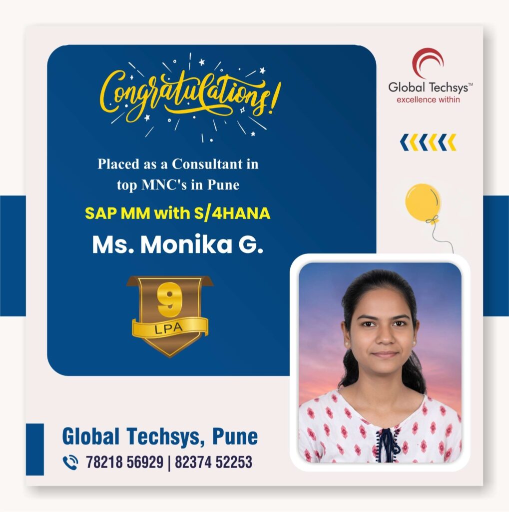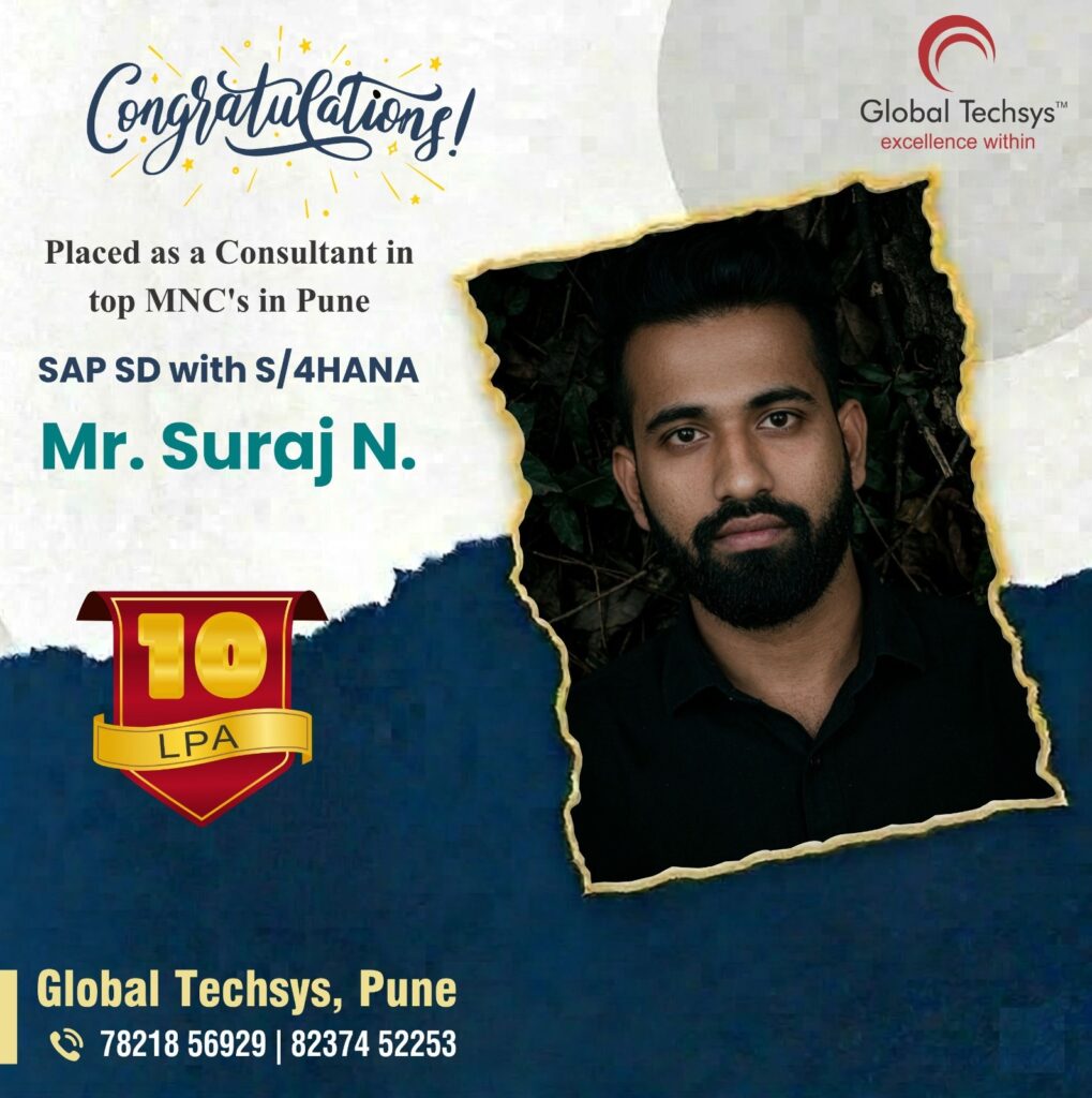 At Global Techsys Learning, our students don’t just learn—they excel. The Placement Gallery is a testament to the dedication and hard work of our graduates who have secured prestigious positions in top companies worldwide. Explore the success stories of our students, complete with their job titles and package details, and see how Global Techsys Learning has helped them transform their careers.